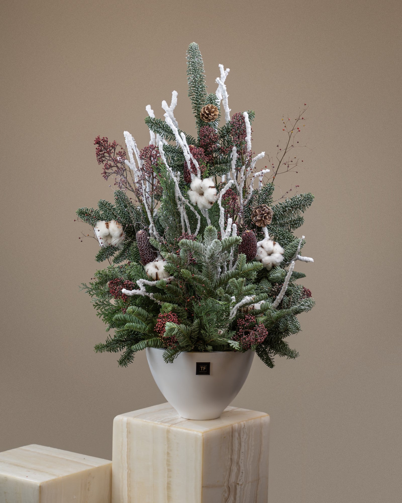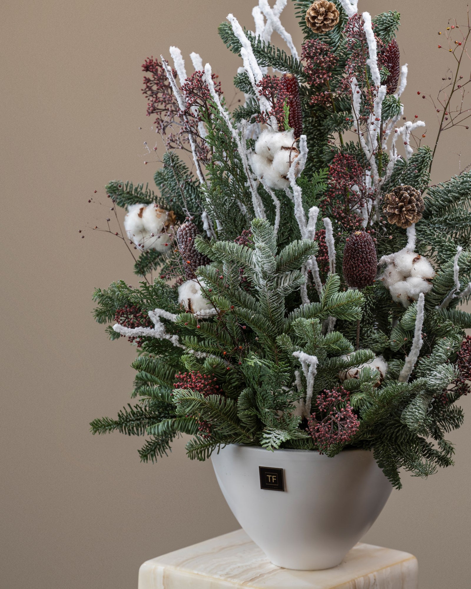 استمتعي بأجواء الشتاء الرائعة مع كريستينا، وهي باقة زهور أنيقة مصنوعة بإتقان من أزهار بيضاء موسمية ولمسات زاهية من اللونين الوردي والأحمر. صُممت لتستحضر شعورًا بالفخامة والرقي، وهي طريقة جميلة لإضفاء بريق الشتاء على أي منزل.