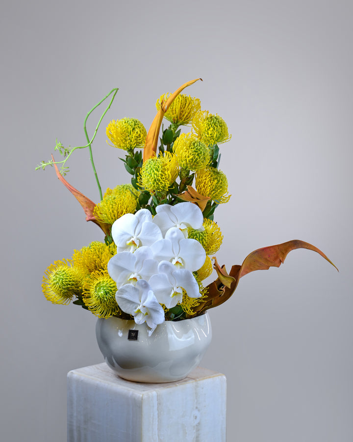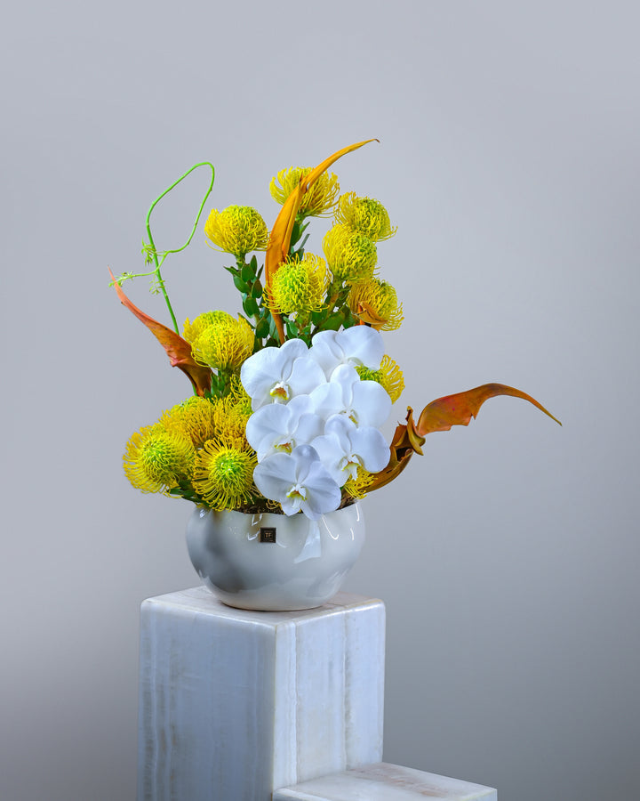 Embrace the elegant harmony of yellow and white flowers, softly illuminated by the warmth of the sun. This refined blend offers a graceful infusion of light and color, perfect for creating a serene and uplifting ambiance with understated sophistication.