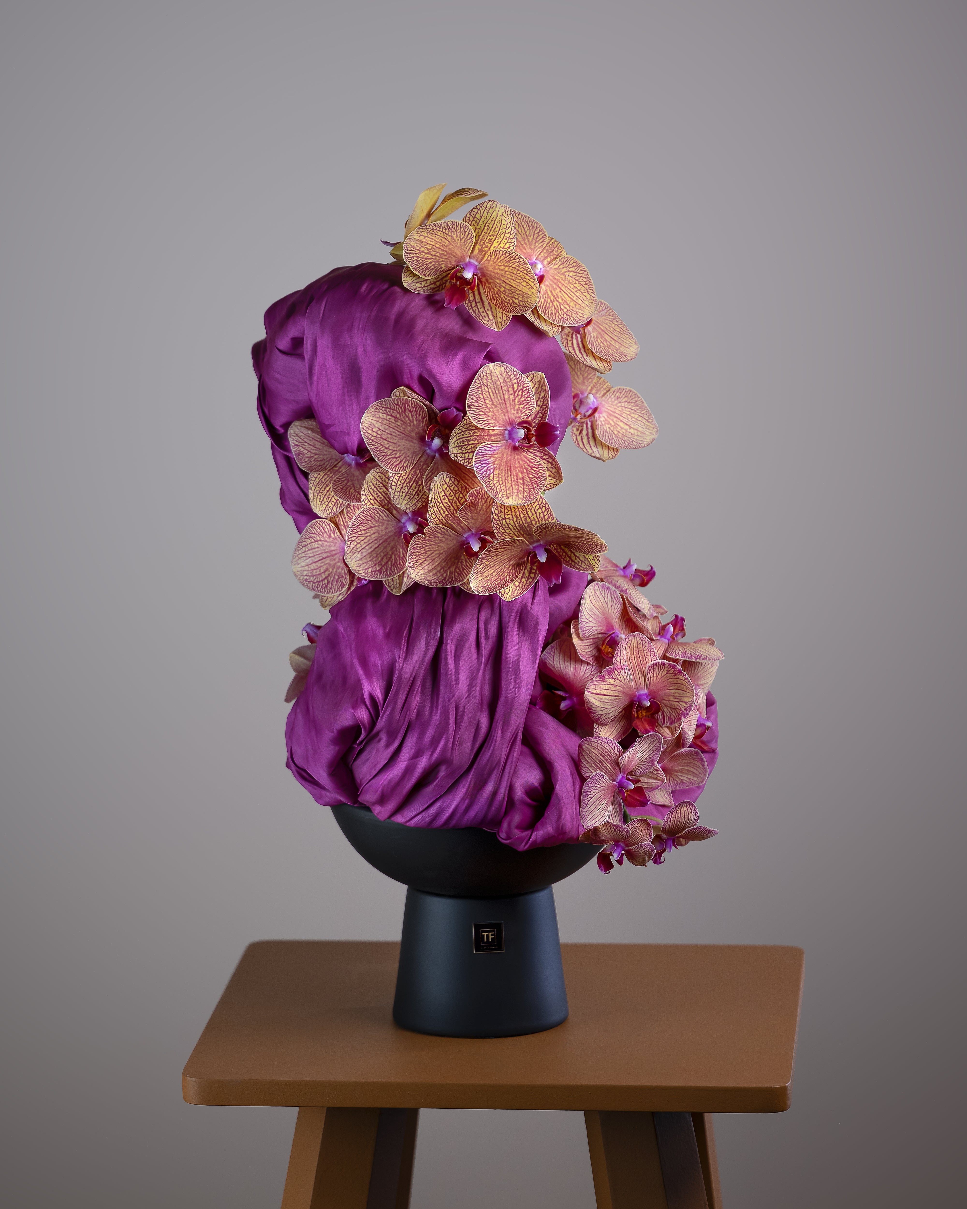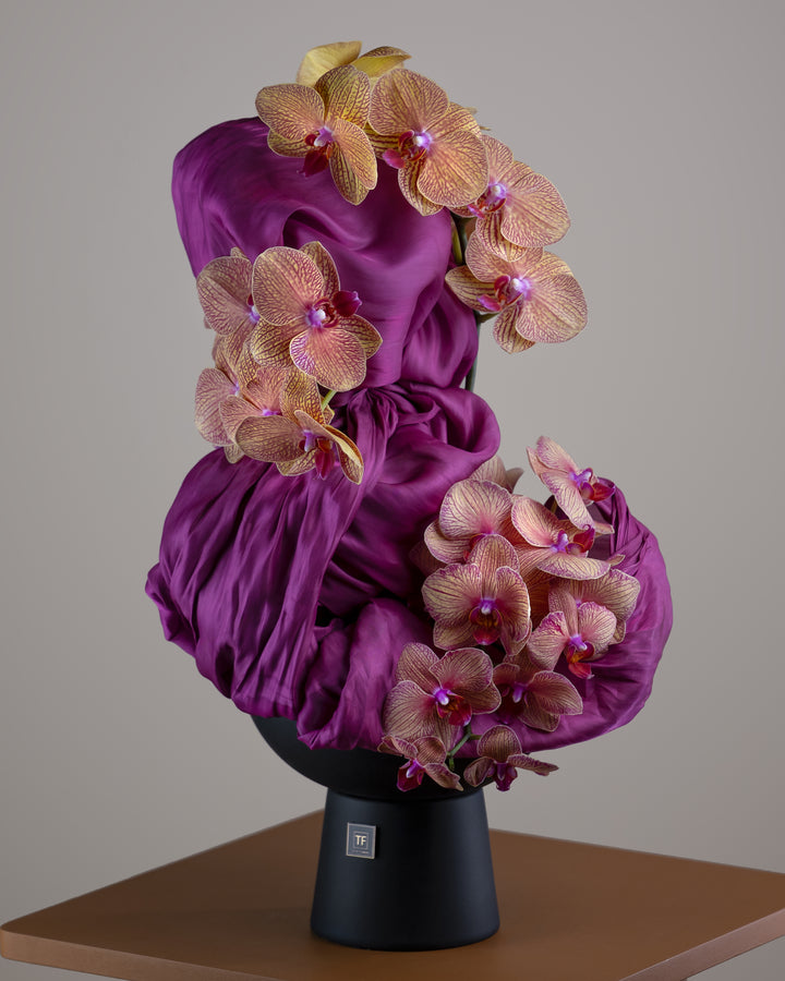 Crimson Poise exemplifies the pinnacle of floral artistry, combining textile-inspired sculptural design with the elegance of fashion and contemporary art. This exquisite arrangement transforms luxurious blooms into a harmonious composition, offering a sophisticated statement that enhances any refined setting.