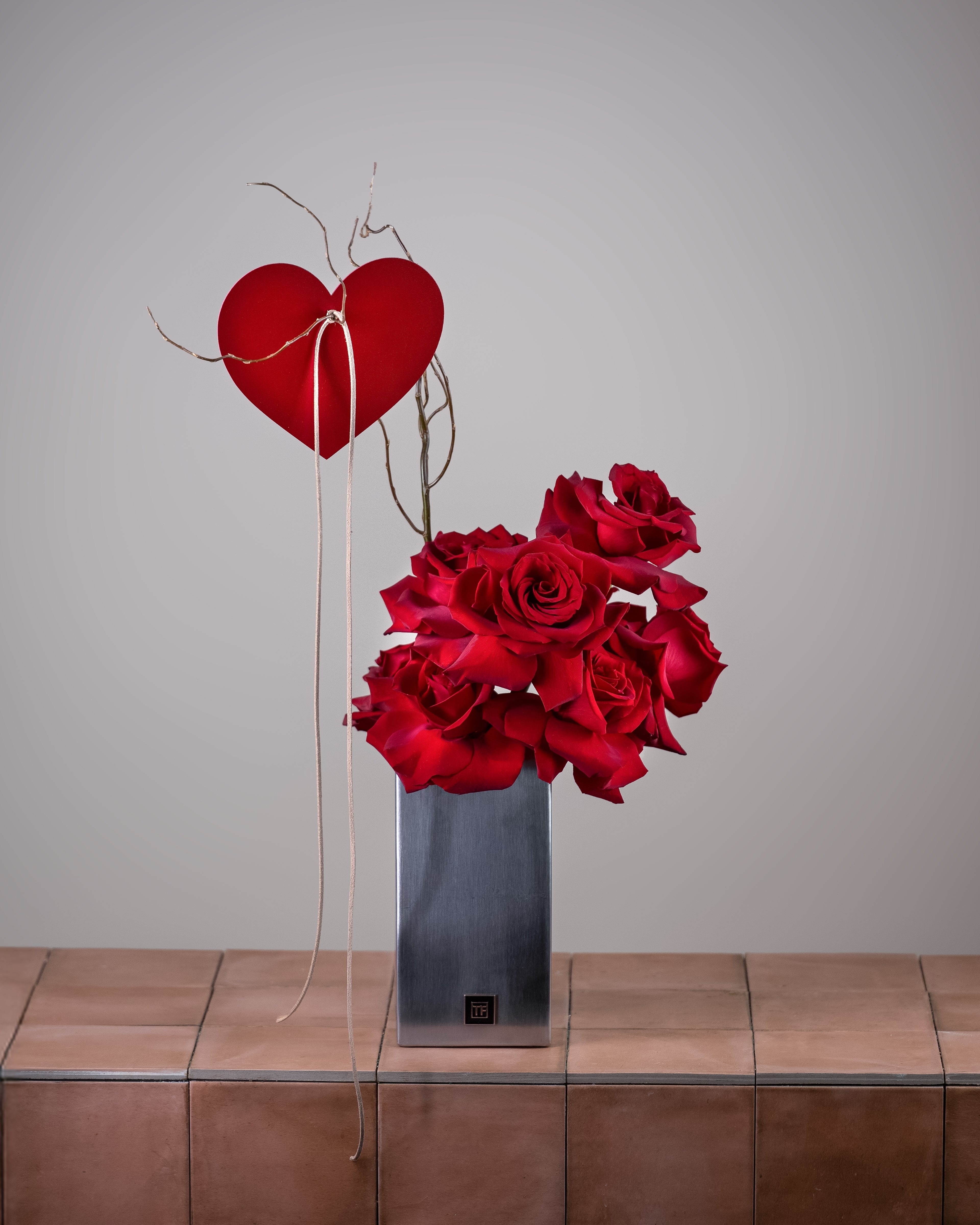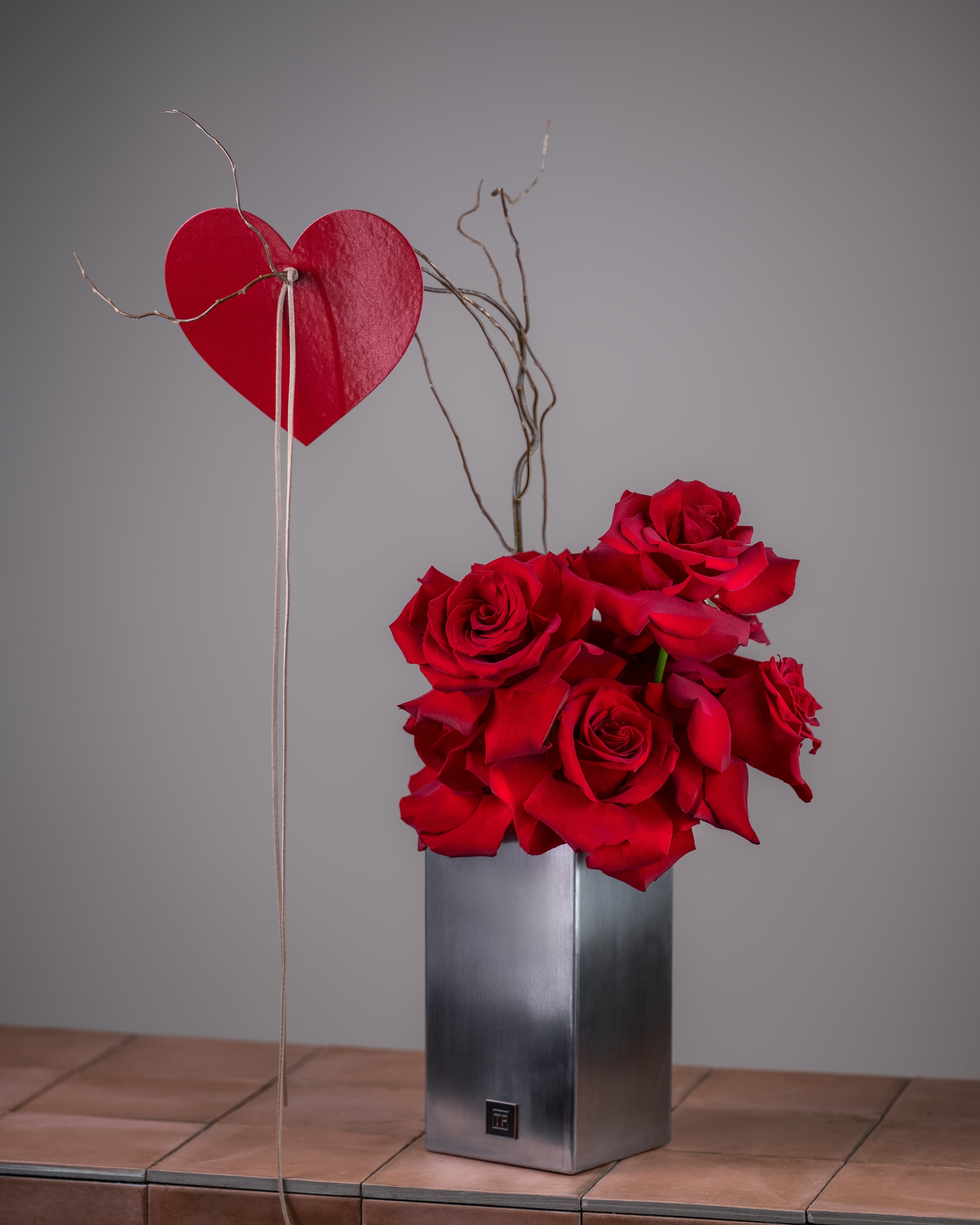 Elevate your gift-giving with this sophisticated silver vase arrangement, where timeless elegance meets heartfelt sentiment. Featuring a curated selection of vibrant red roses nestled in a sleek metallic vessel, this composition exudes refined charm. The addition of a delicate leather heart accent adds a personal, romantic touch that speaks volumes. Perfect for anniversaries, declarations of love, or any occasion deserving of understated luxury, this arrangement transforms a simple gesture into a memorable keepsake that captures emotion in its purest form.