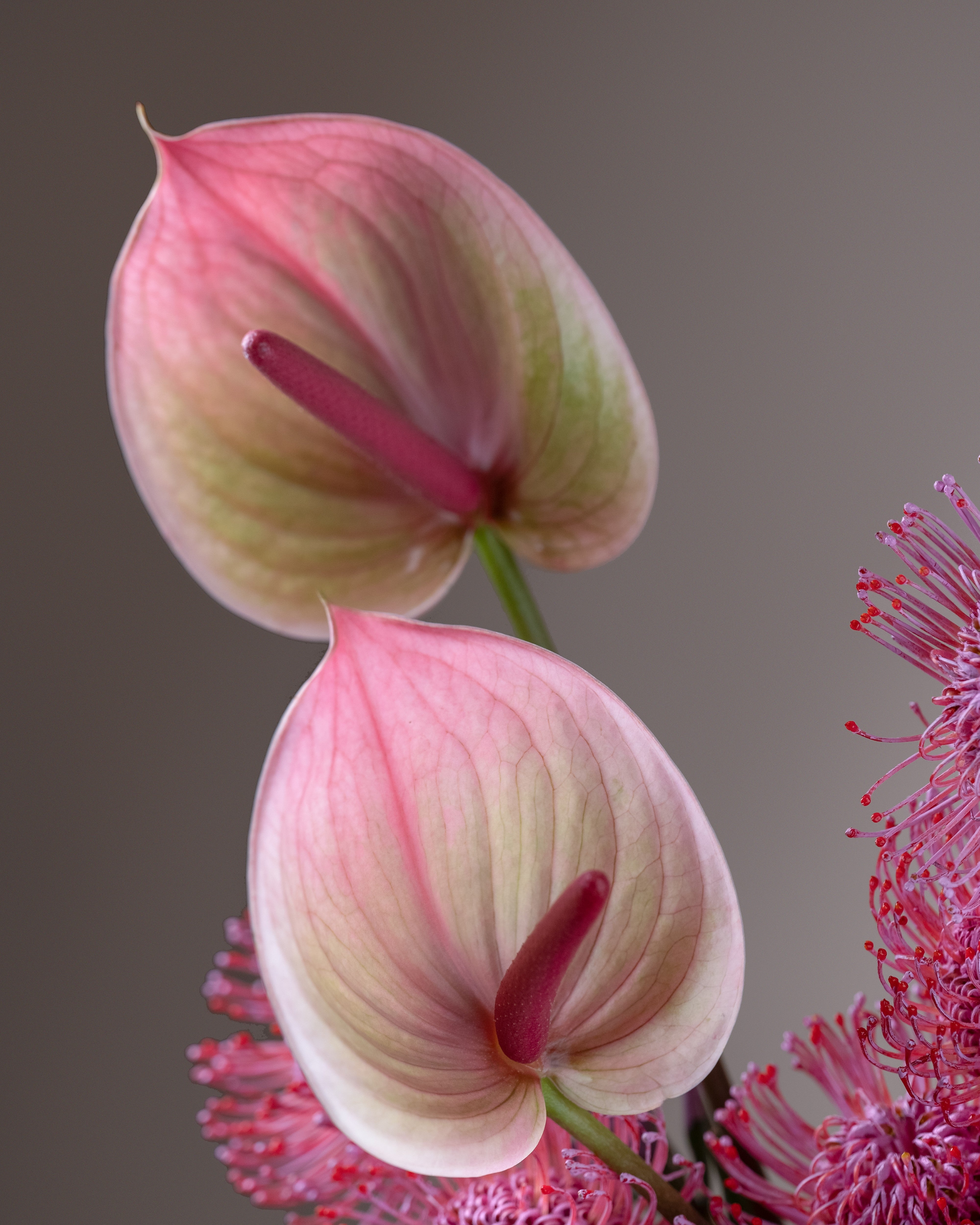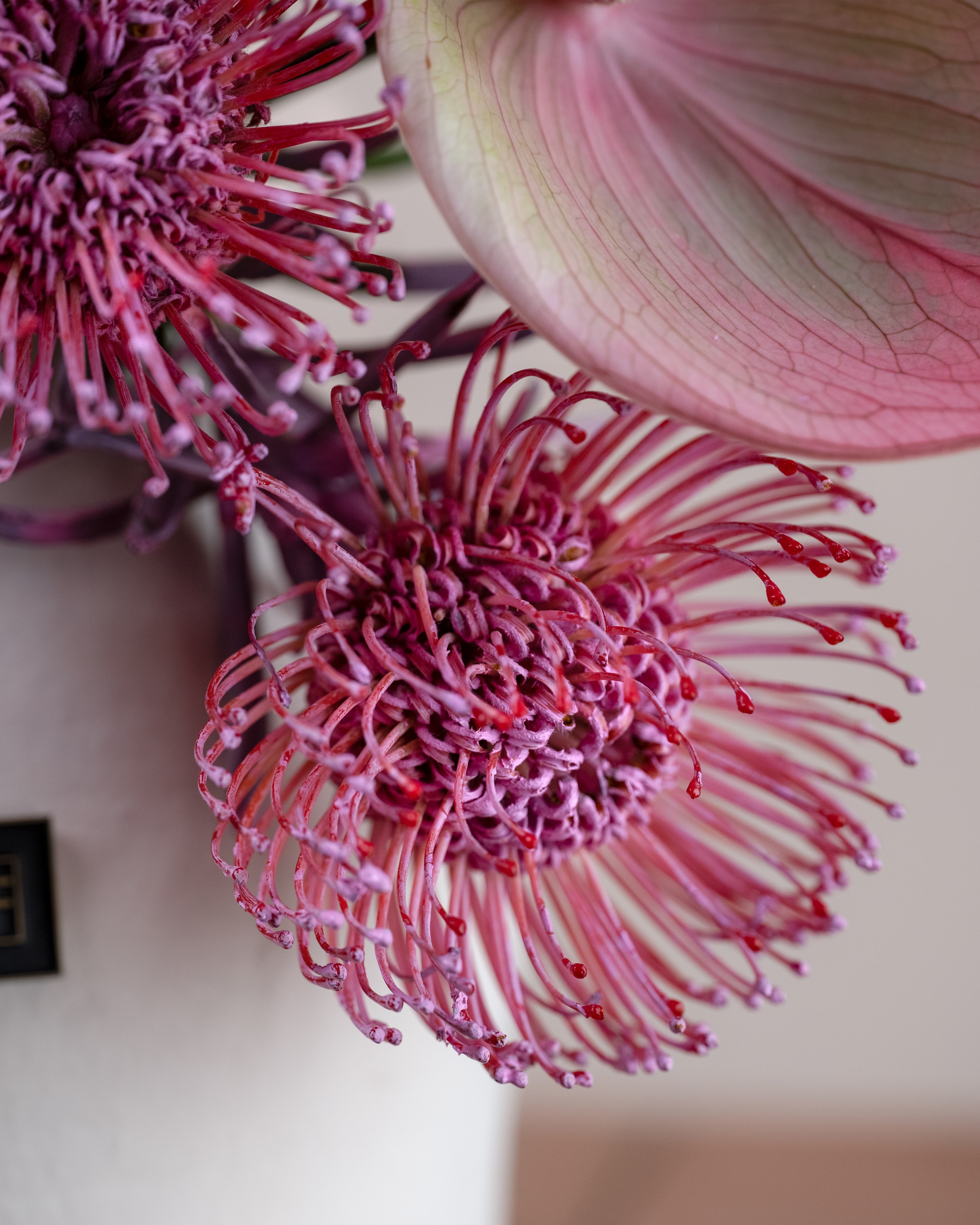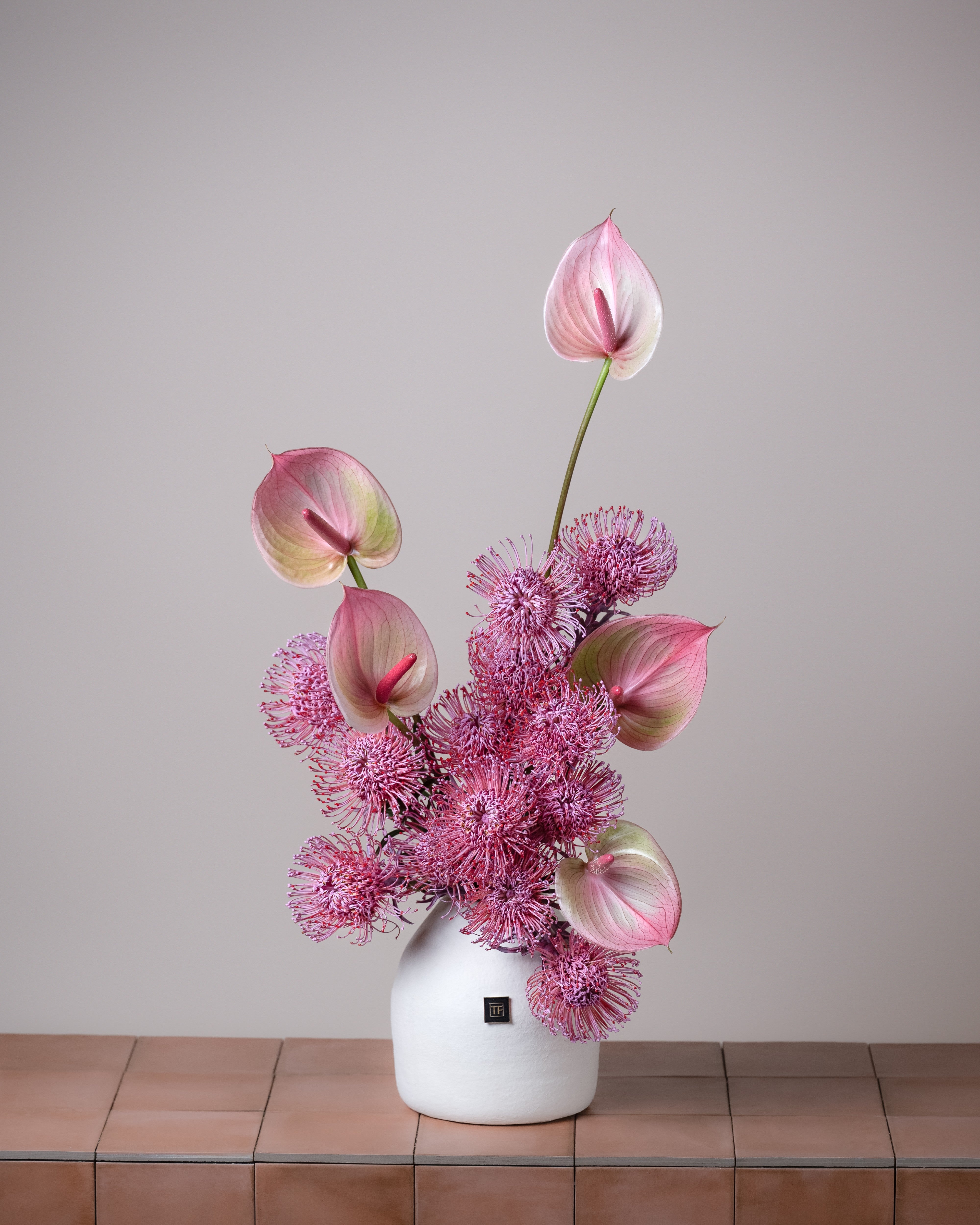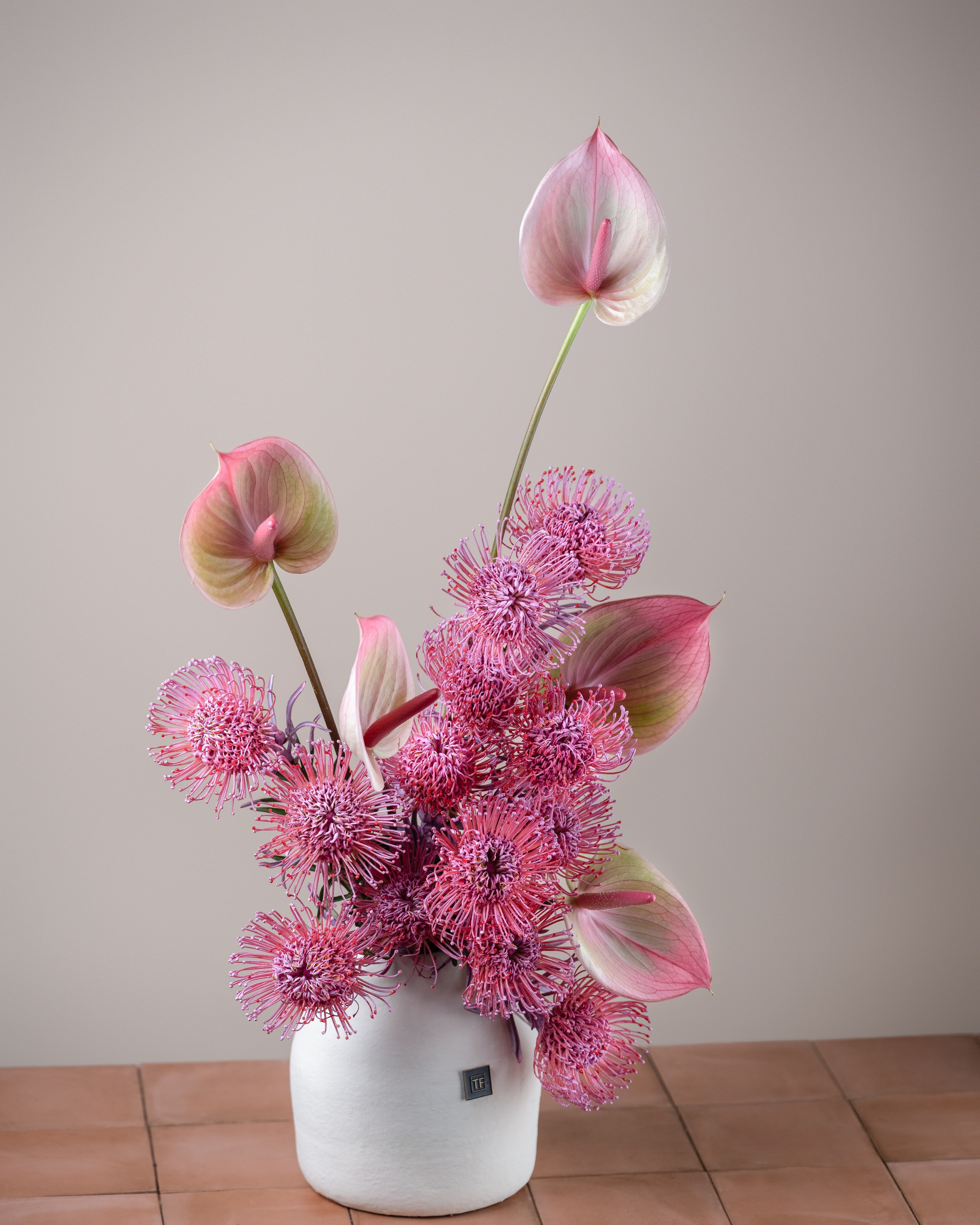 Pink Radiance is a modern and eye-catching floral arrangement featuring a refined mix of soft pink anthuriums and textured pincushion-style blooms, beautifully arranged in a minimalist ceramic vase. Designed with clean lines and artistic balance, this arrangement brings a sense of elegance, freshness, and contemporary charm to any interior. Ideal for home décor, office styling, or as a sophisticated gift, Pink Radiance adds a graceful pop of color and texture to any space.