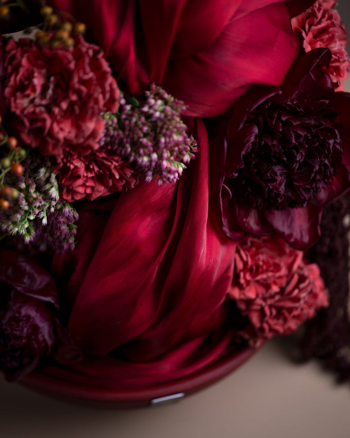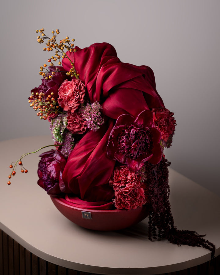 Red Opulence showcases an exquisite fusion of sumptuous fabrics and carefully selected blooms, creating a striking artistic arrangement. This sophisticated piece blends texture and color seamlessly, offering an elegant statement that enhances any space with refined beauty and timeless charm. Ideal for those who appreciate a luxurious touch in their décor.