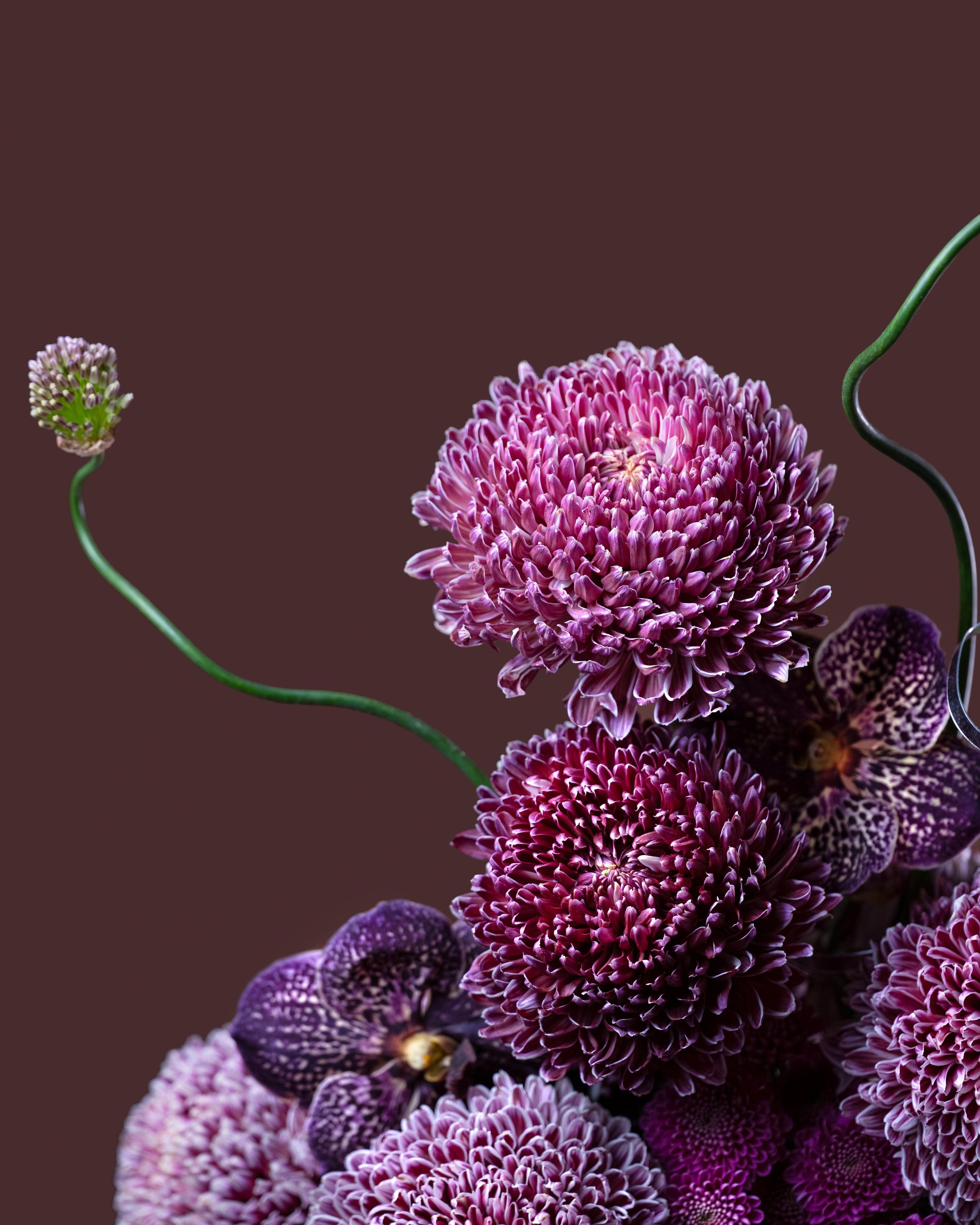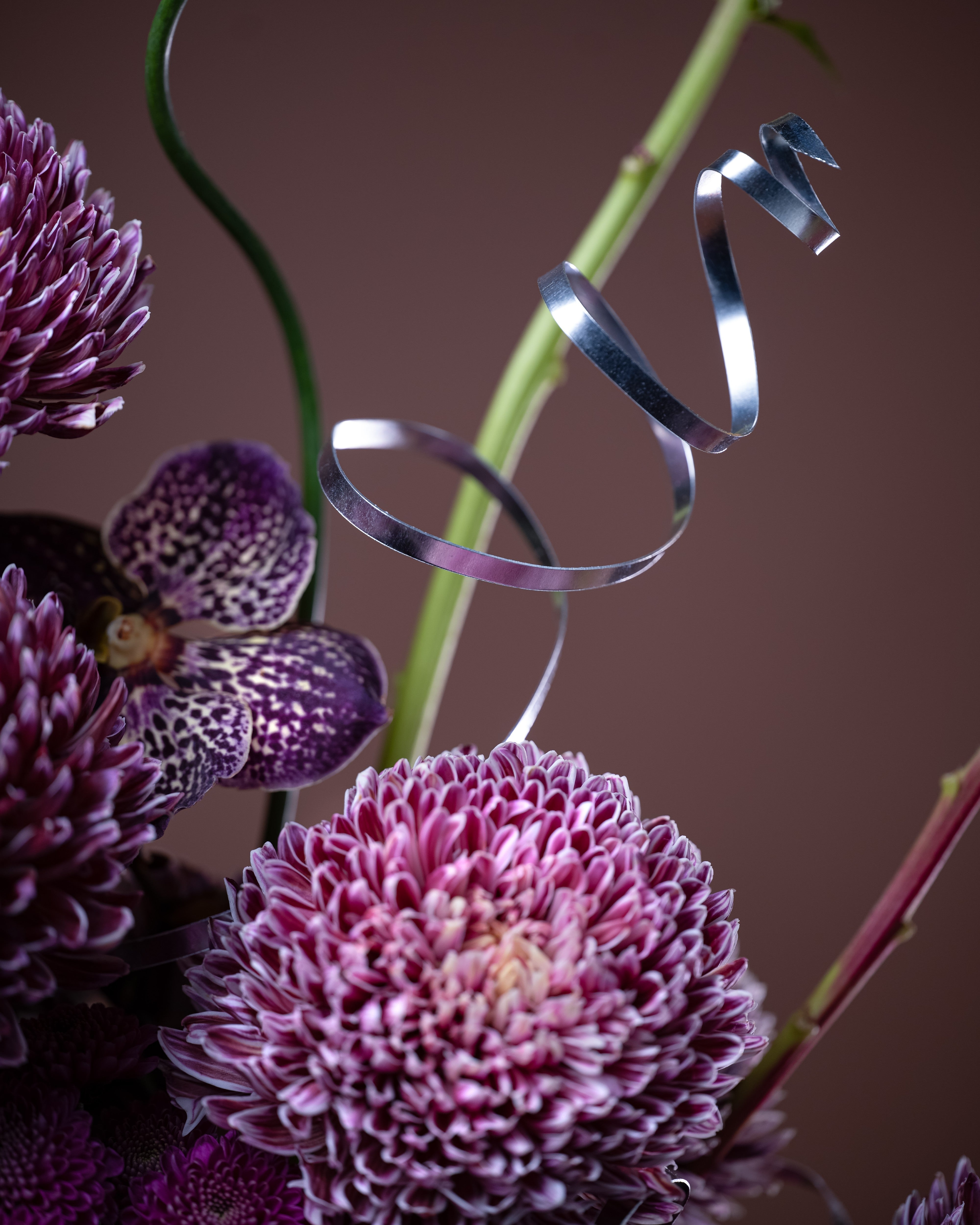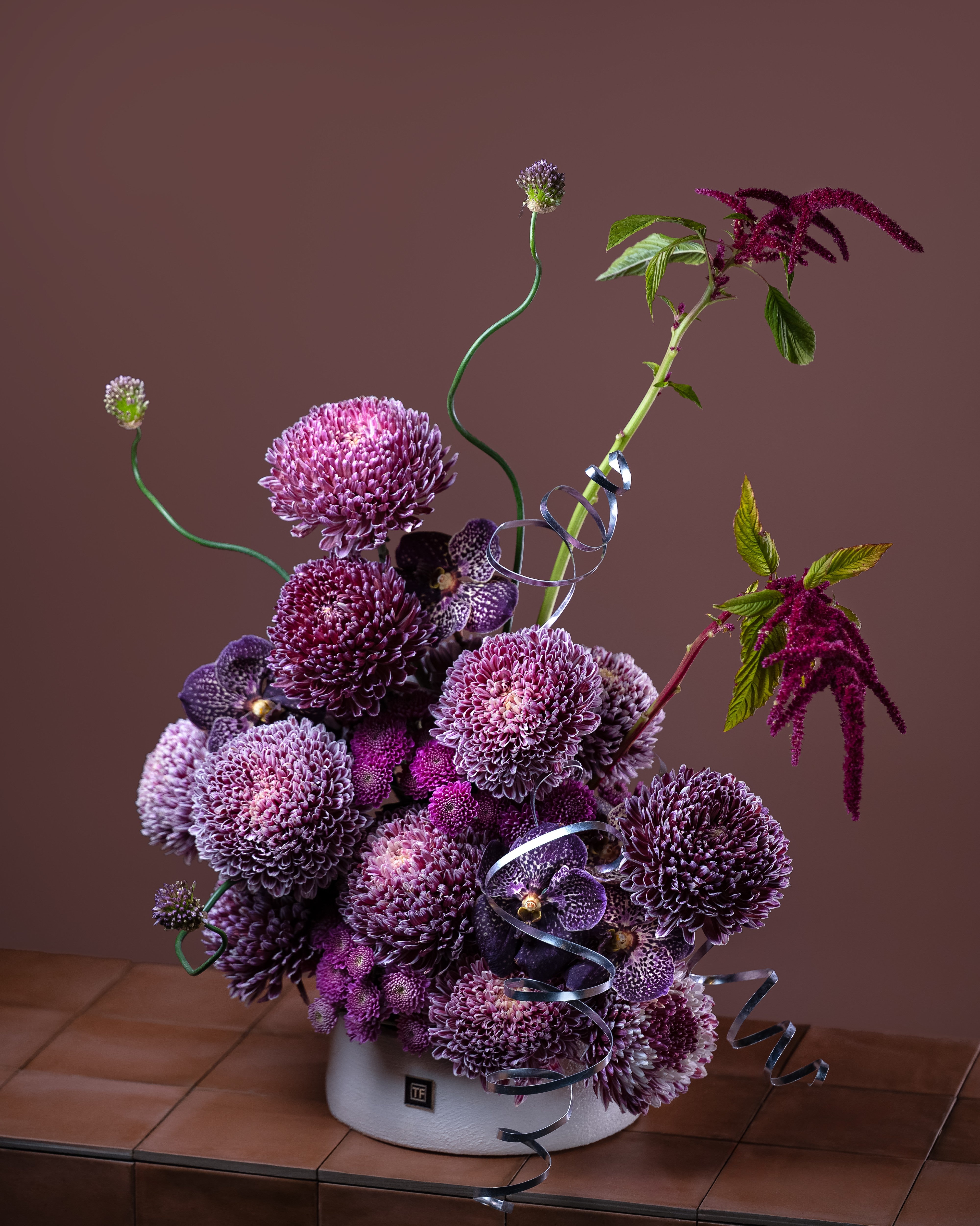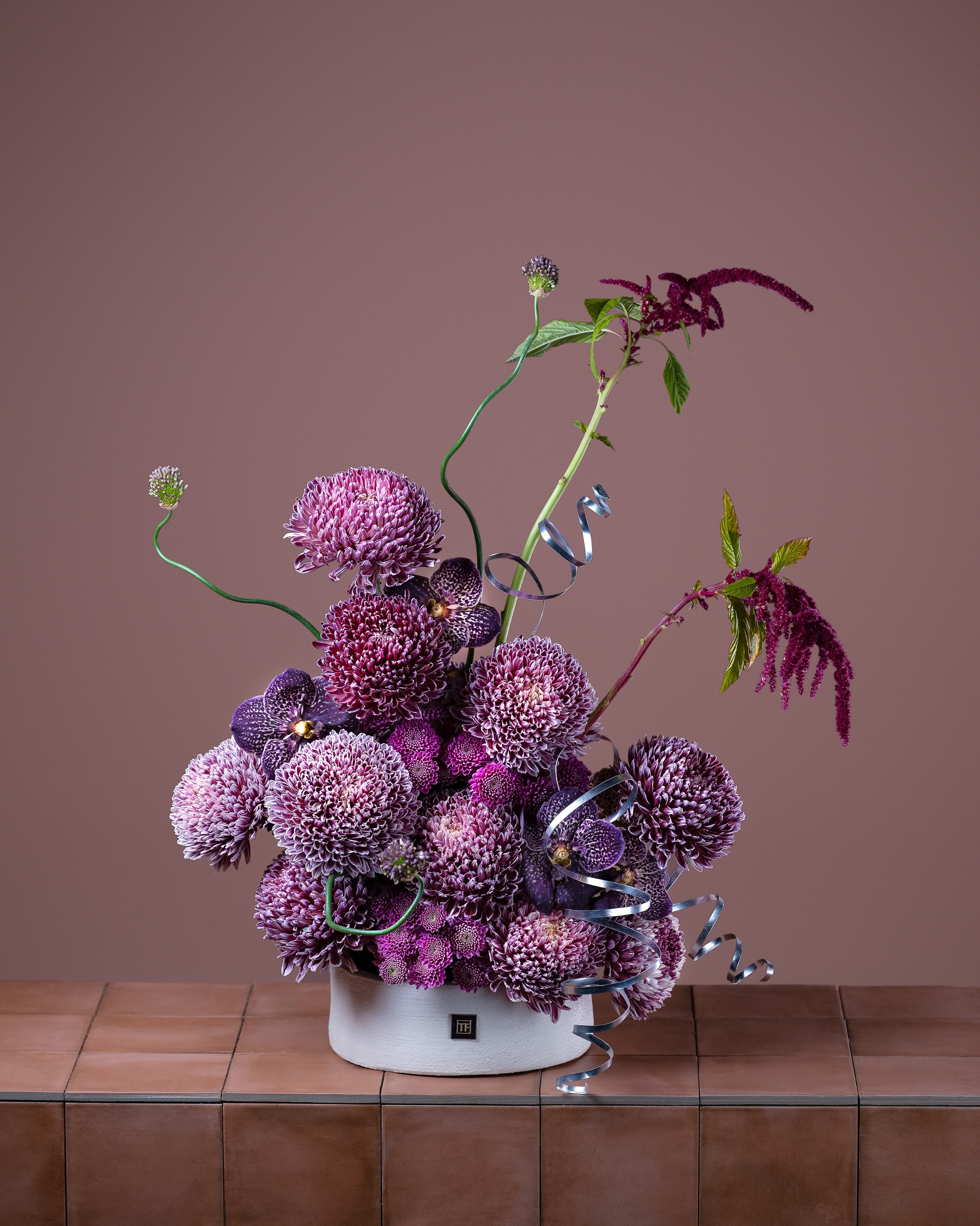 Violet Majesty is a luxurious floral arrangement featuring rich deco chrysanthemums paired with elegant vanda orchids in a modern vase. With its deep violet tones and refined texture, it creates a bold yet sophisticated centerpiece—perfect for upscale interiors, events, or statement gifting.