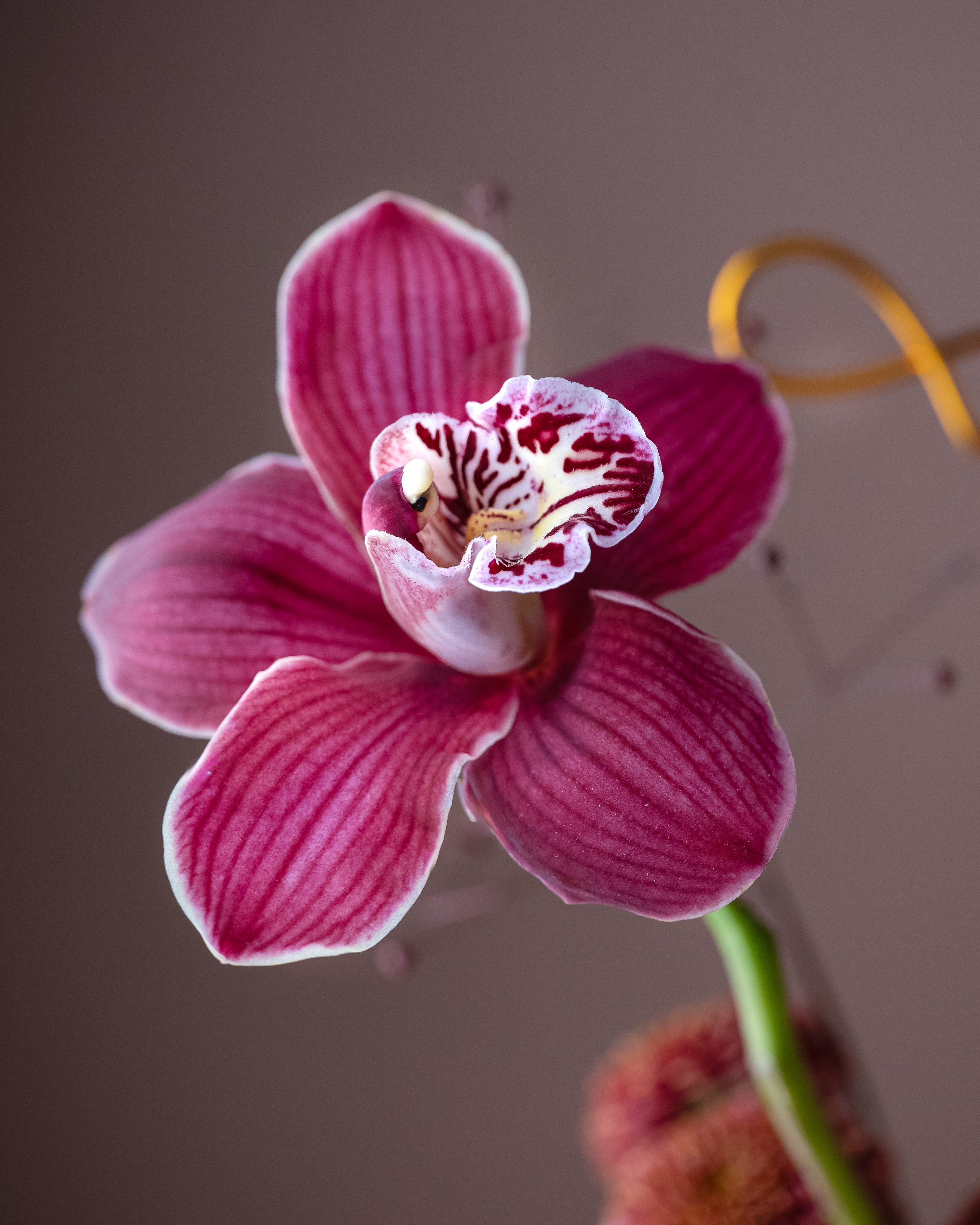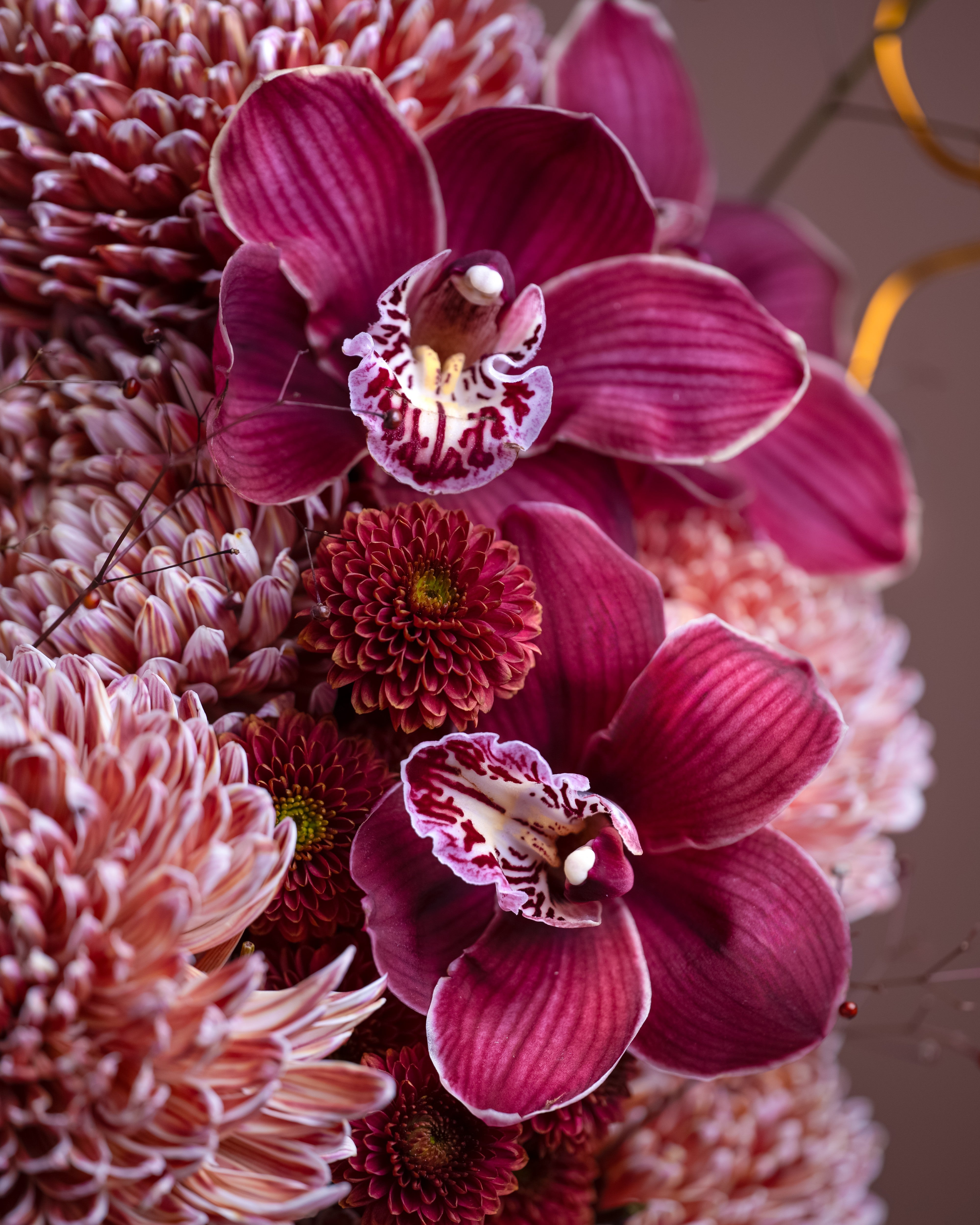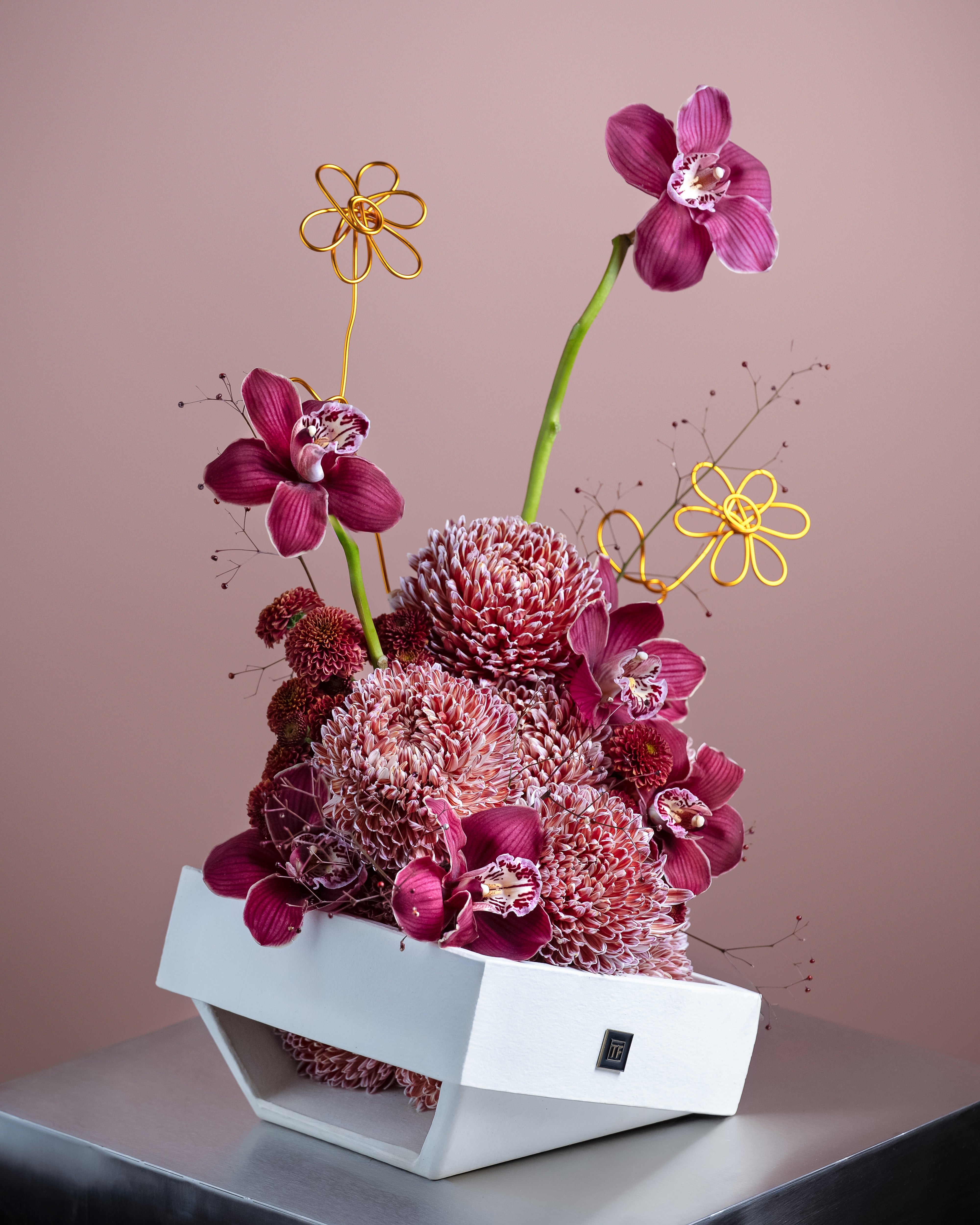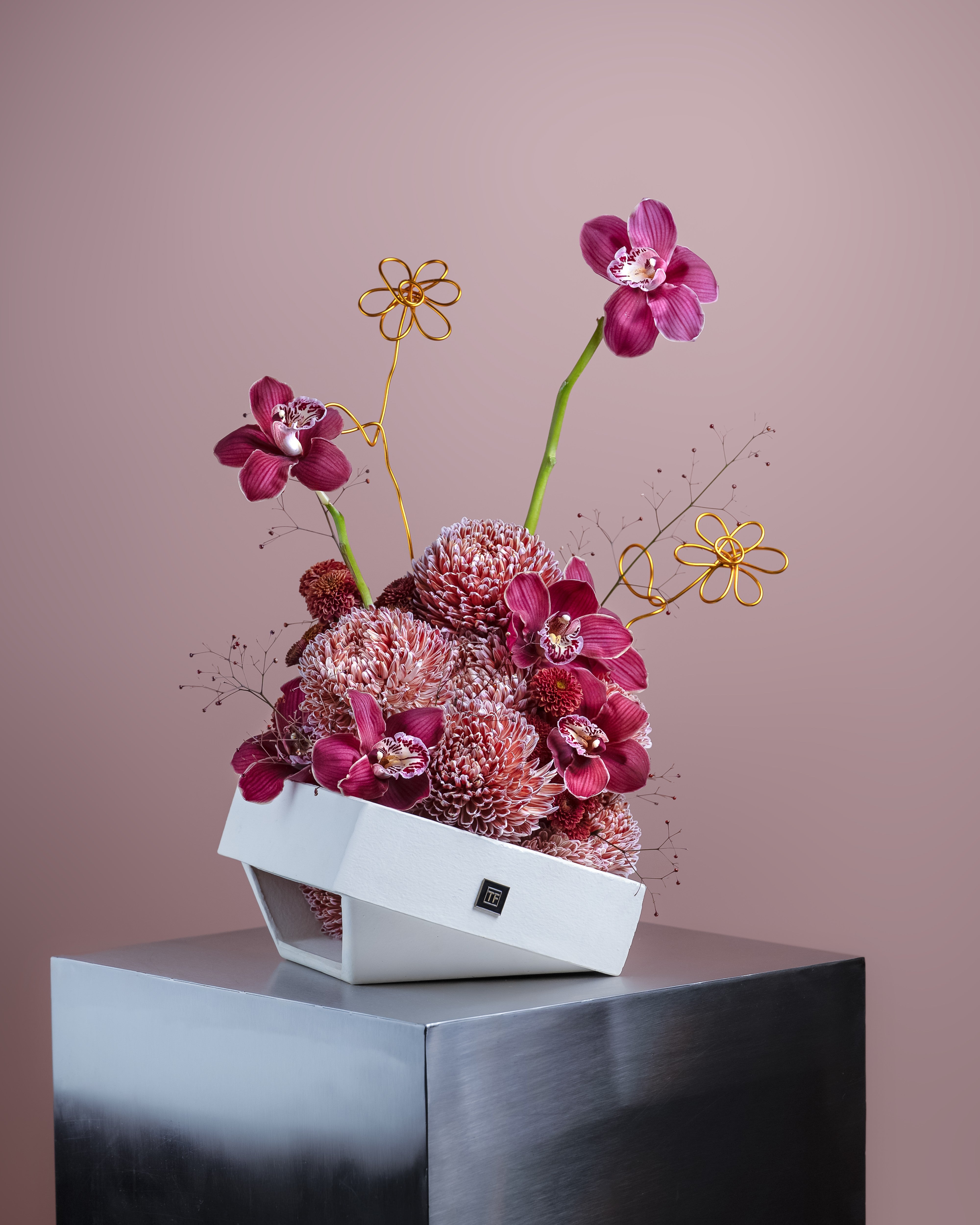 Floral Geometry is a modern, design-forward floral arrangement that combines rich berry tones with clean architectural lines. Featuring sculptural chrysanthemums and elegant cymbidium orchids, accented with delicate fillers and artistic metallic details, this arrangement is set in a contemporary geometric vase. The composition highlights balance, structure, and texture, making it a striking statement piece for luxury interiors, offices, or upscale gifting.
