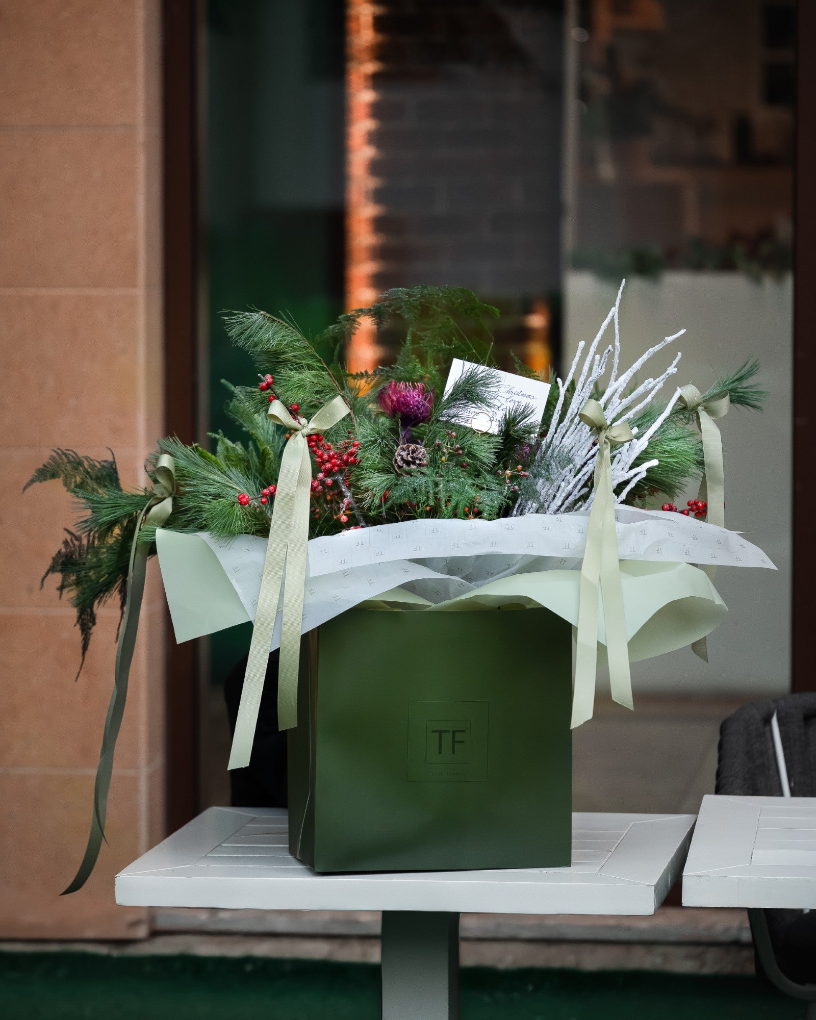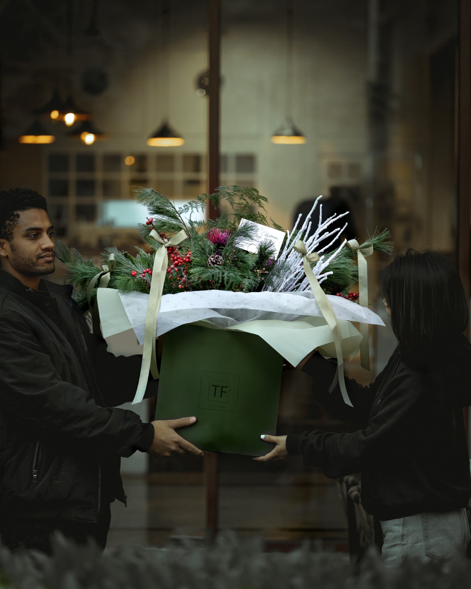 # Winter Wonderland Transform your space into a frosty paradise with this enchanting floral arrangement. Featuring crisp whites, cool silvers, and icy blues, each bloom captures the magic of a winter's day. Perfect for holiday celebrations, festive gatherings, or bringing seasonal cheer to any room. This stunning composition combines delicate flowers with complementary greenery to create a show-stopping centerpiece that sparkles with seasonal wonder. Ideal for gifting or treating yourself to a touch of winter magic.